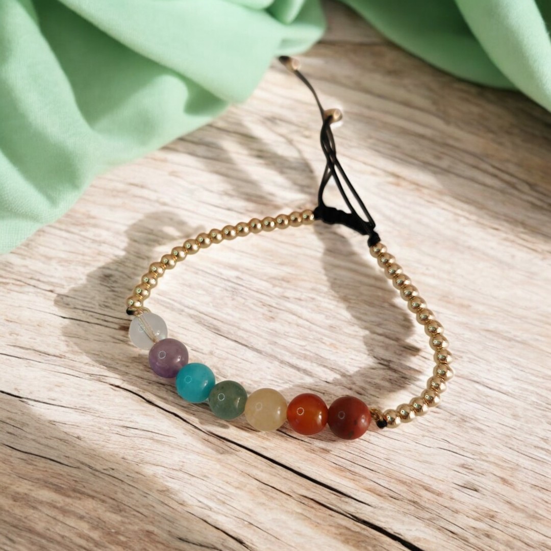 Pulseira com cordão ajustável ao pulso. Pedras naturais de Cristal, Sodalita, Aguá Marinha, Quartzo Verde, Olho de Tigre, Opala e Jaspe Vermelho.